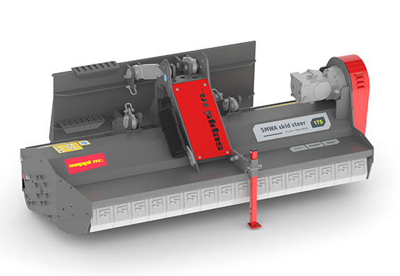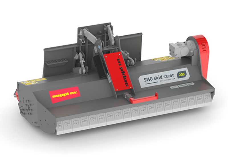 Professional skid steer mounted mulching mower for material up to 5cm diameter. Floating linkage follows ground contours.